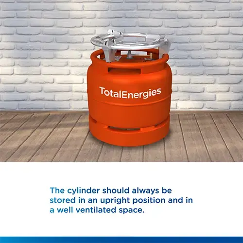 - Always store the cylinder in an upright position and in a well-ventilated space away from heat, open fire or children.
