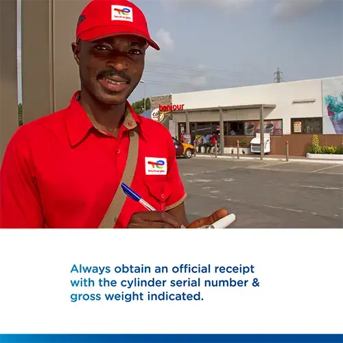 - On making payment, obtain an official receipt with cylinder serial number and gross weight indicated